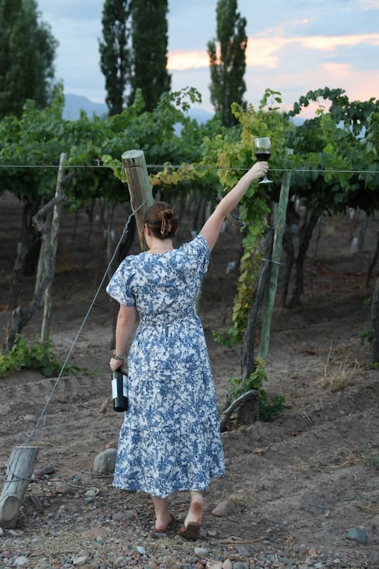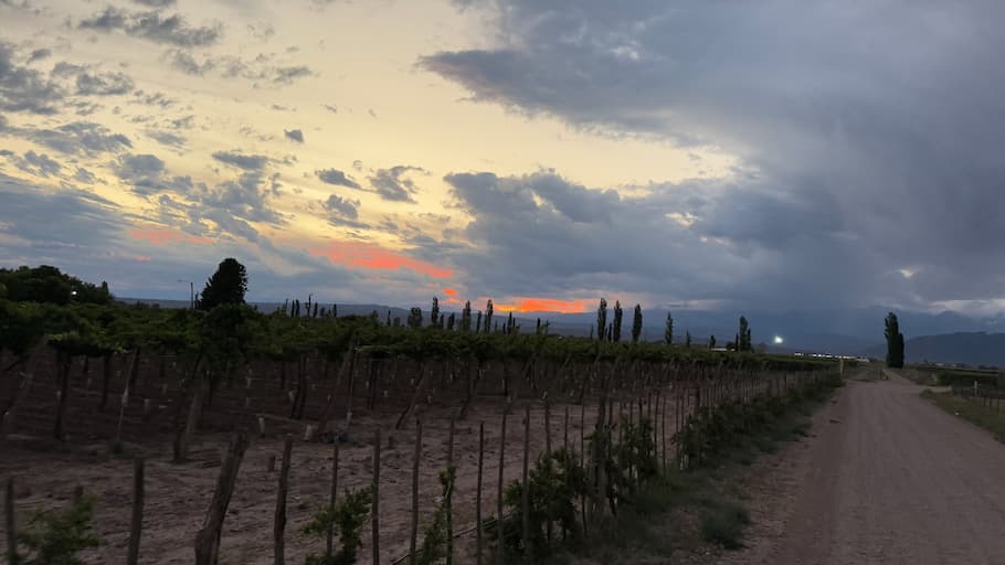 As day transitioned to evening at Cavas Wine Lodge, the vineyards of Agrelo transformed into a romantic setting for wine tasting among the vines. The golden hour provided perfect lighting for capturing memories against the backdrop of rows of carefully tended grapevines. The experience culminated with breathtaking views of the sun setting behind the mountain silhouettes, painting the sky in dramatic hues that perfectly complemented the vineyard landscape below.