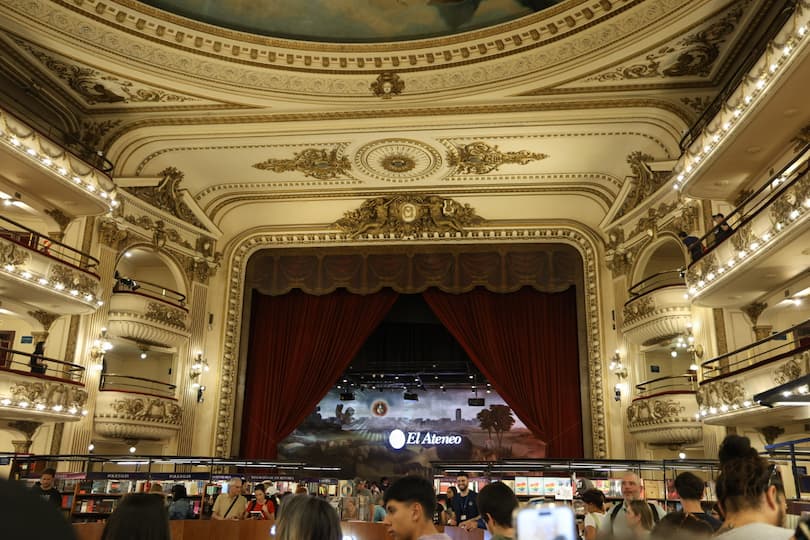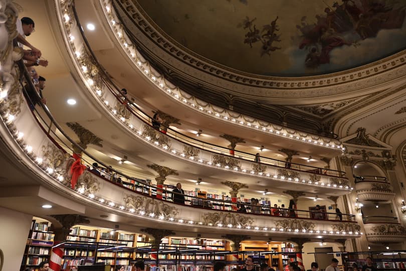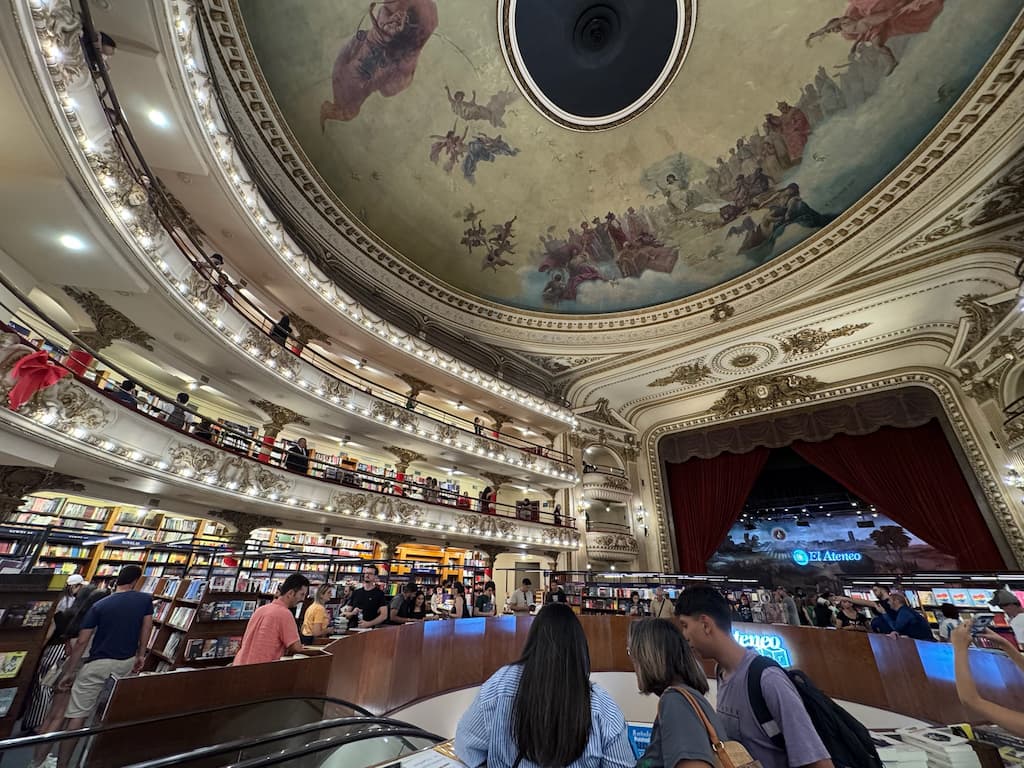 El Ateneo Grand Splendid was a highlight of our Buenos Aires explorations. This bookstore in a converted theater features stunning ornate ceiling details, with old theater boxes transformed into cozy reading nooks. We enjoyed browsing the extensive collection of books while admiring how they’ve repurposed the stage into an elegant cafĆ©, preserving the building’s theatrical heritage.