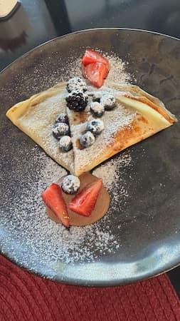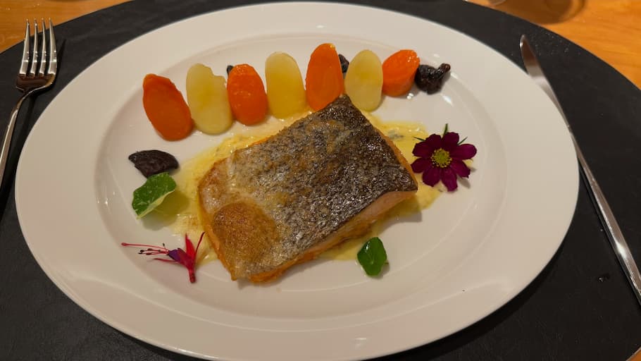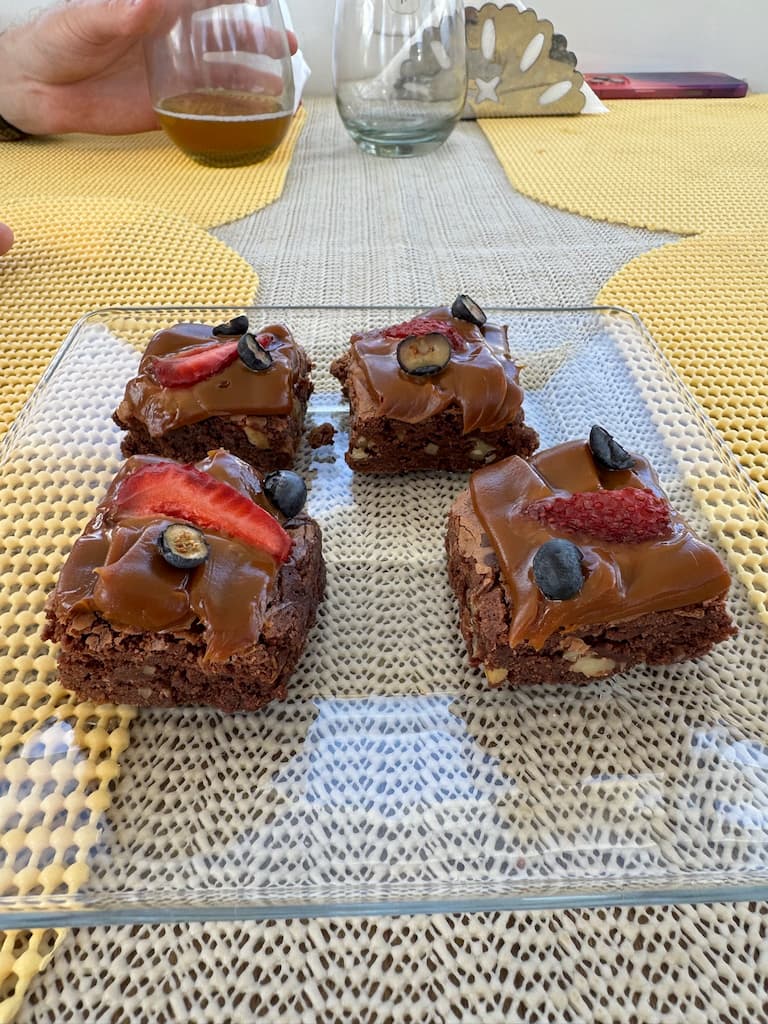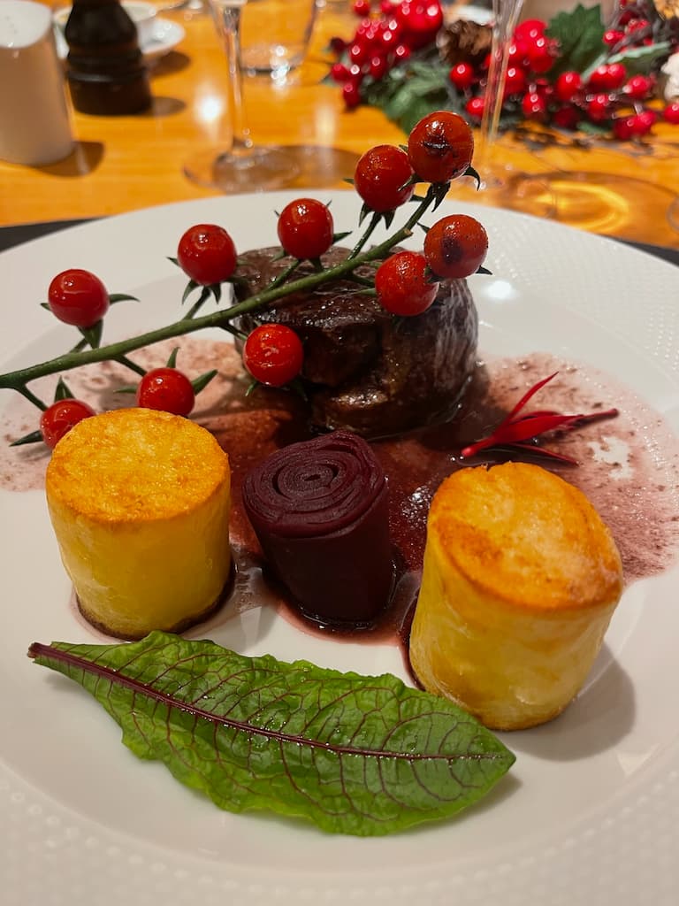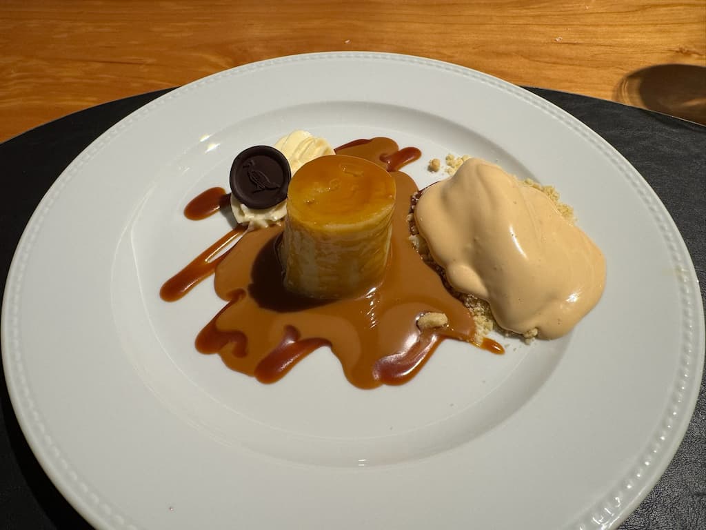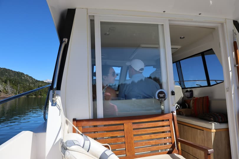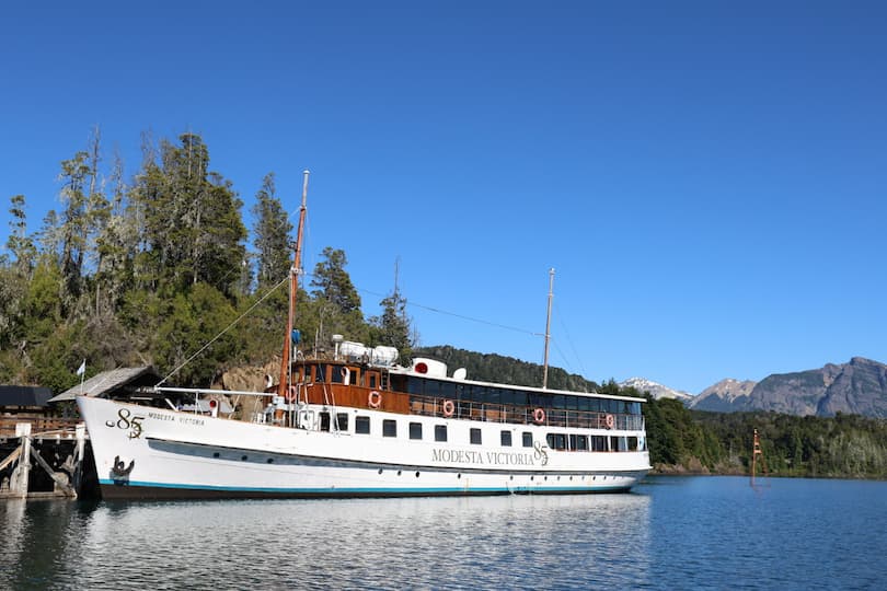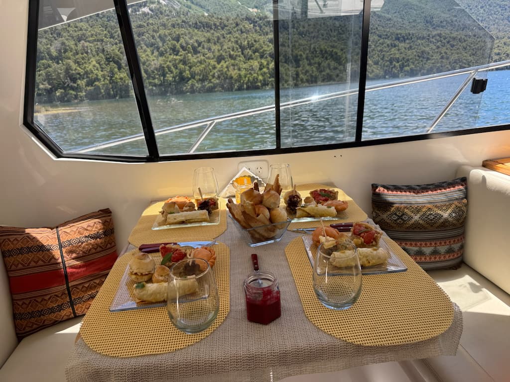 We enjoyed an exquisite dining experience aboard the vessel, surrounded by breathtaking views of Lago Nahuel Huapi and its mountain backdrop. Our meal featured beautifully arranged dishes, from savory appetizers to decadent chocolate brownies with fruit garnishes. The large windows provided stunning panoramic views of the water and surrounding forest throughout our meal, creating a unique dining atmosphere you just can’t get in a regular restaurant.