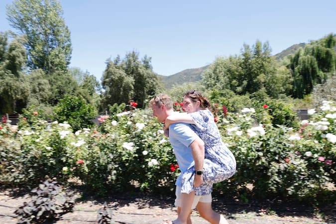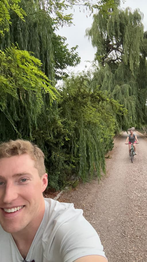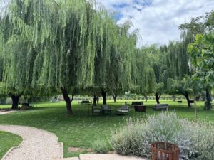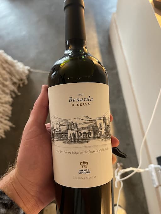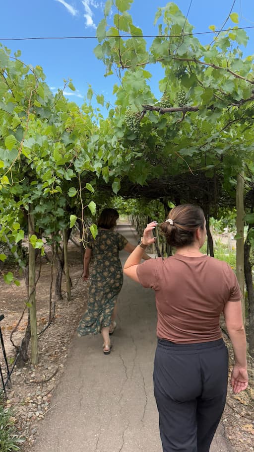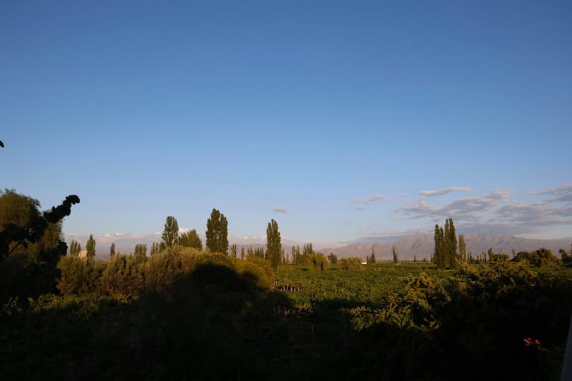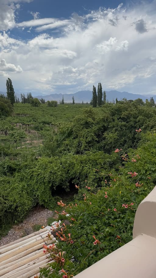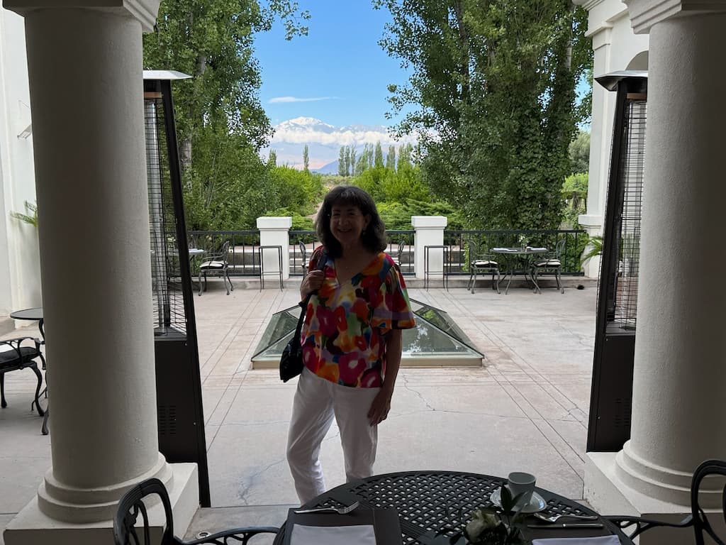 We spent time exploring more of Cavas Wine Lodge in the morning light, which beautifully illuminated the picturesque vineyard pathways and offered stunning Andes Mountain vistas. The property had many charming details to discover, like a creative driftwood Christmas tree that complemented the rustic elegance of the place. We particularly enjoyed the white-columned courtyard with its breathtaking mountain panoramas, and the tranquil garden spaces with willow trees and vibrant flower beds that invited peaceful contemplation. Later in the day, we had more encounters with the friendly resident tabby cat and indulged in some chocolate-dipped pastries that showcased the lodge’s exceptional culinary talents.