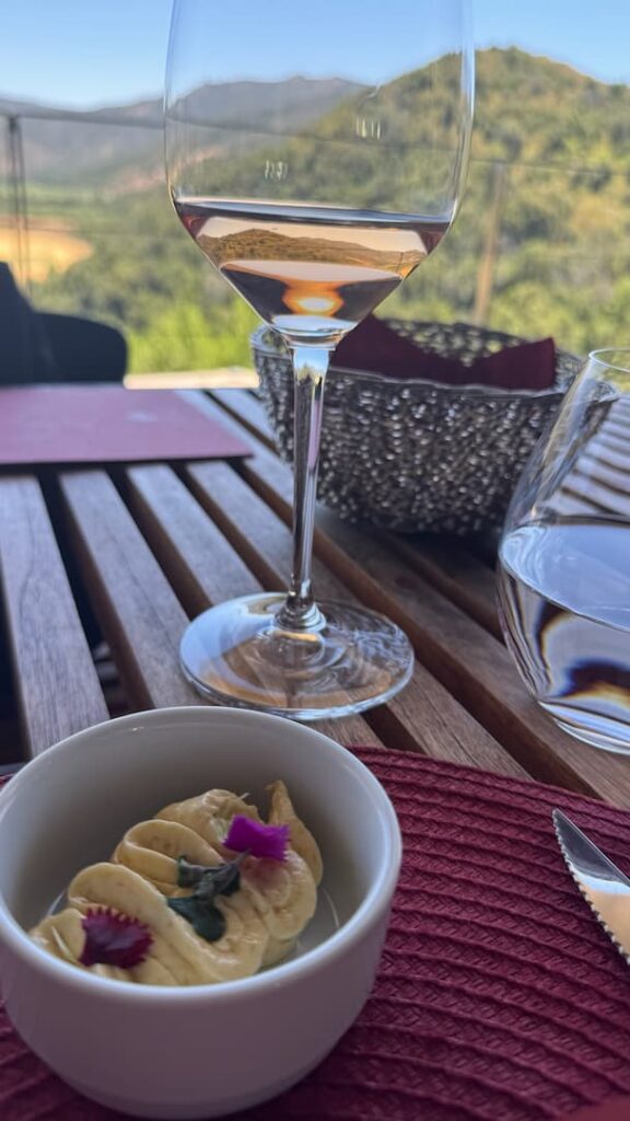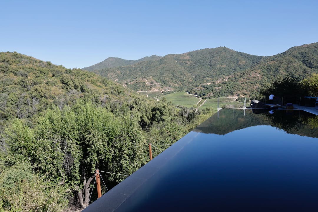 We enjoyed an elegant lunch served poolside at Vik Chile Hotel’s stunning infinity pool. Our gourmet dishes were paired with estate wines, and we savored them against the backdrop of panoramic valley views. It was a perfect blend of culinary excellence and natural beauty, with the edge of the pool seeming to merge seamlessly with the valley landscape beyond.