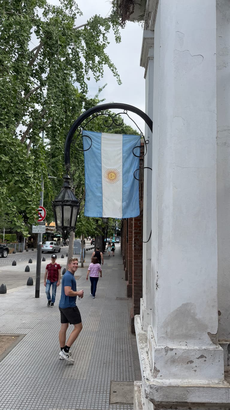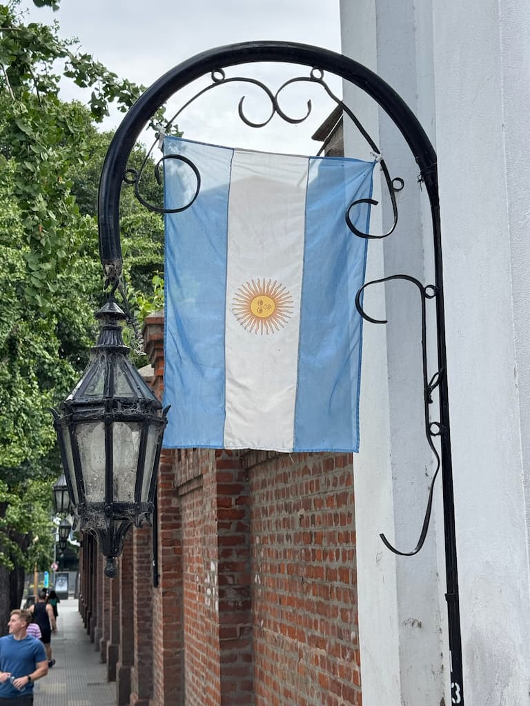 During our leisurely walk through the upscale Recoleta neighborhood, we noticed Argentine flags proudly displayed on lampposts along the avenue. The national colors of light blue and white created a striking visual against the sky. The tree-lined streets added to the charm of this elegant Buenos Aires district, making for a pleasant afternoon stroll.