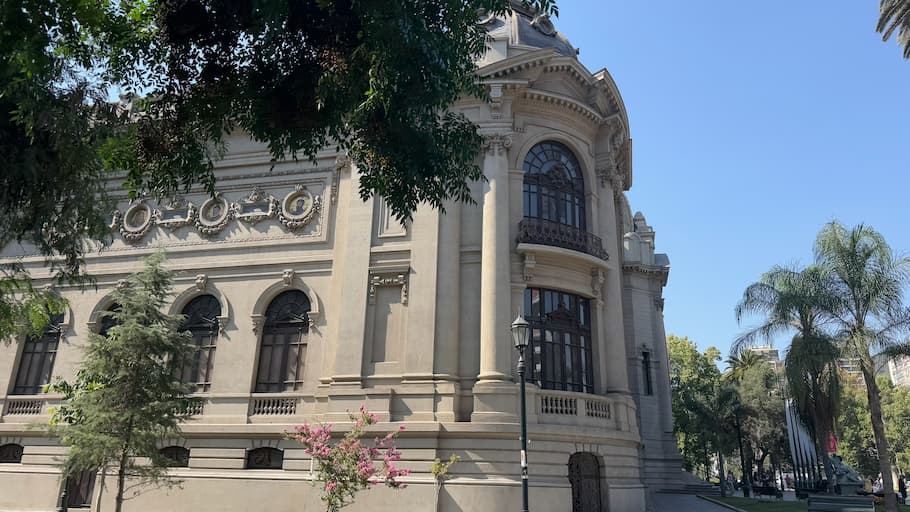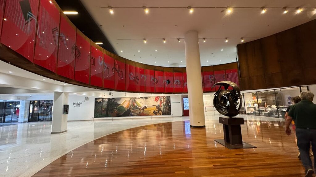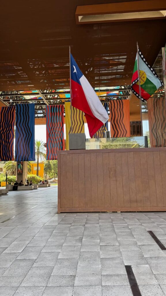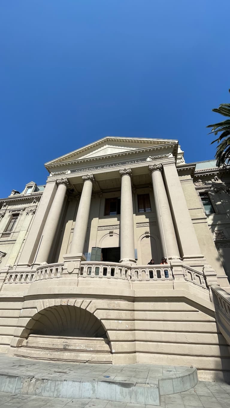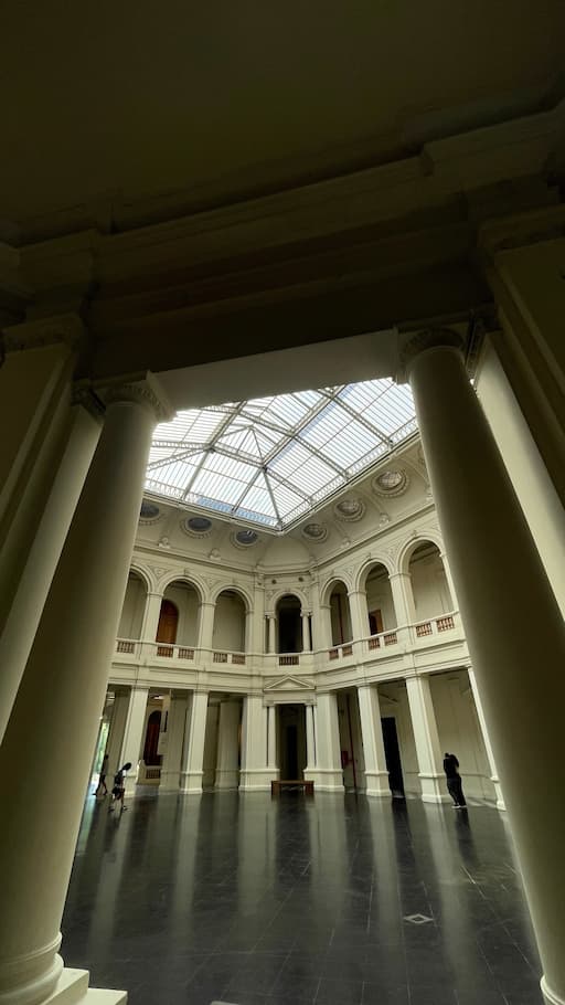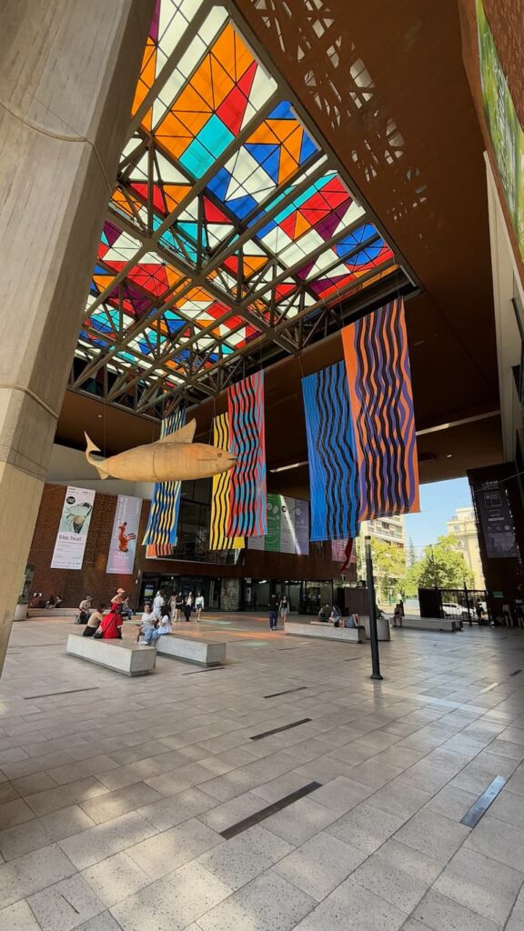 We explored some of Santiago’s architectural heritage through its impressive cultural institutions. Our journey included the neoclassical grandeur of the Museo Nacional de Bellas Artes with its tall columns and ceremonial entrance steps. Inside the MAC Museum of Contemporary Art, we admired an elegant interior hall featuring a soaring glass ceiling, polished floors, and classical columns that created a sophisticated atmosphere where historic architecture framed modern artistic expression.